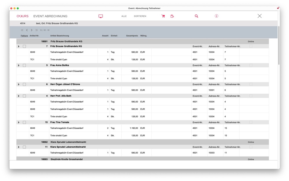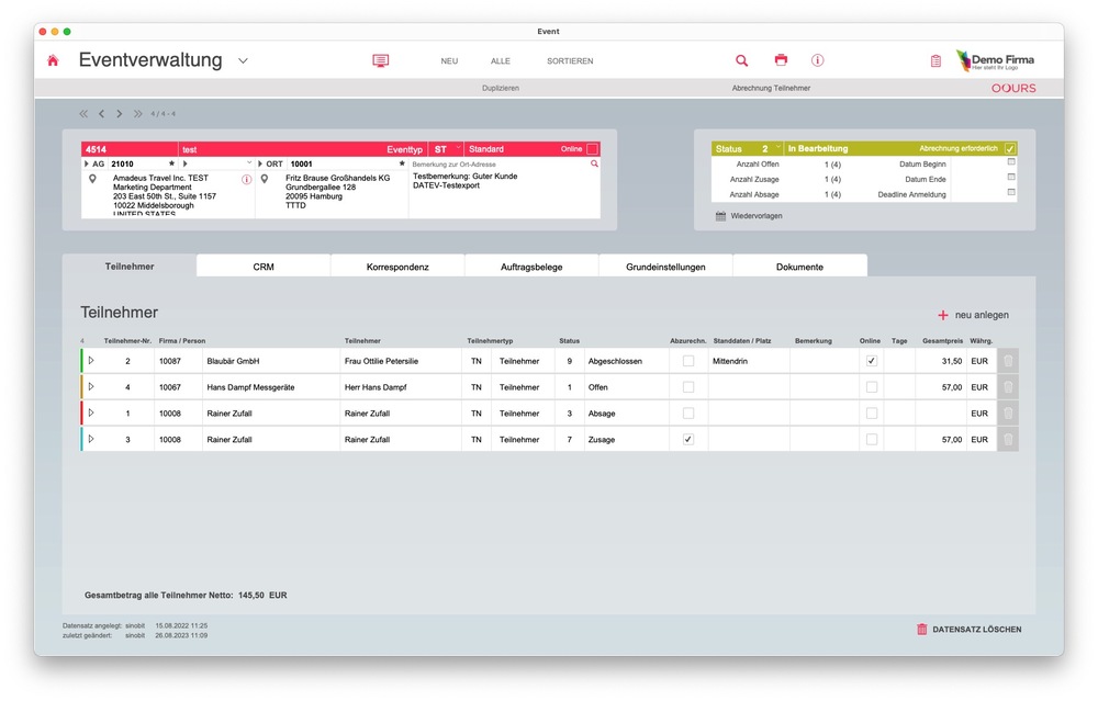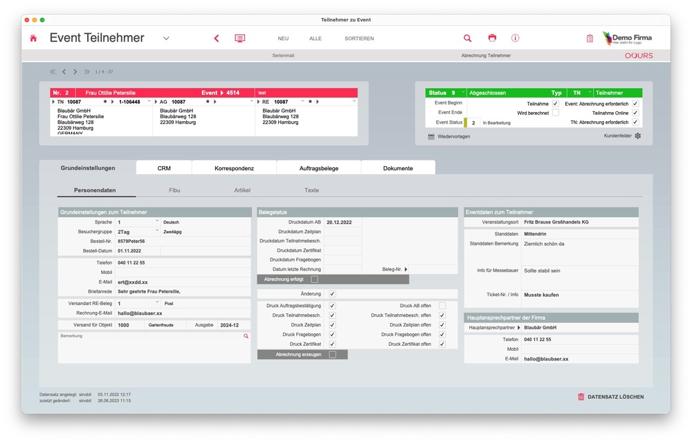 Die Information über eine erfolgte Teilnahme, Einladung etc. eines Teilnehmers wird zudem in der Kundenhistorie in der OOURS Adressverwaltung hinterlegt.